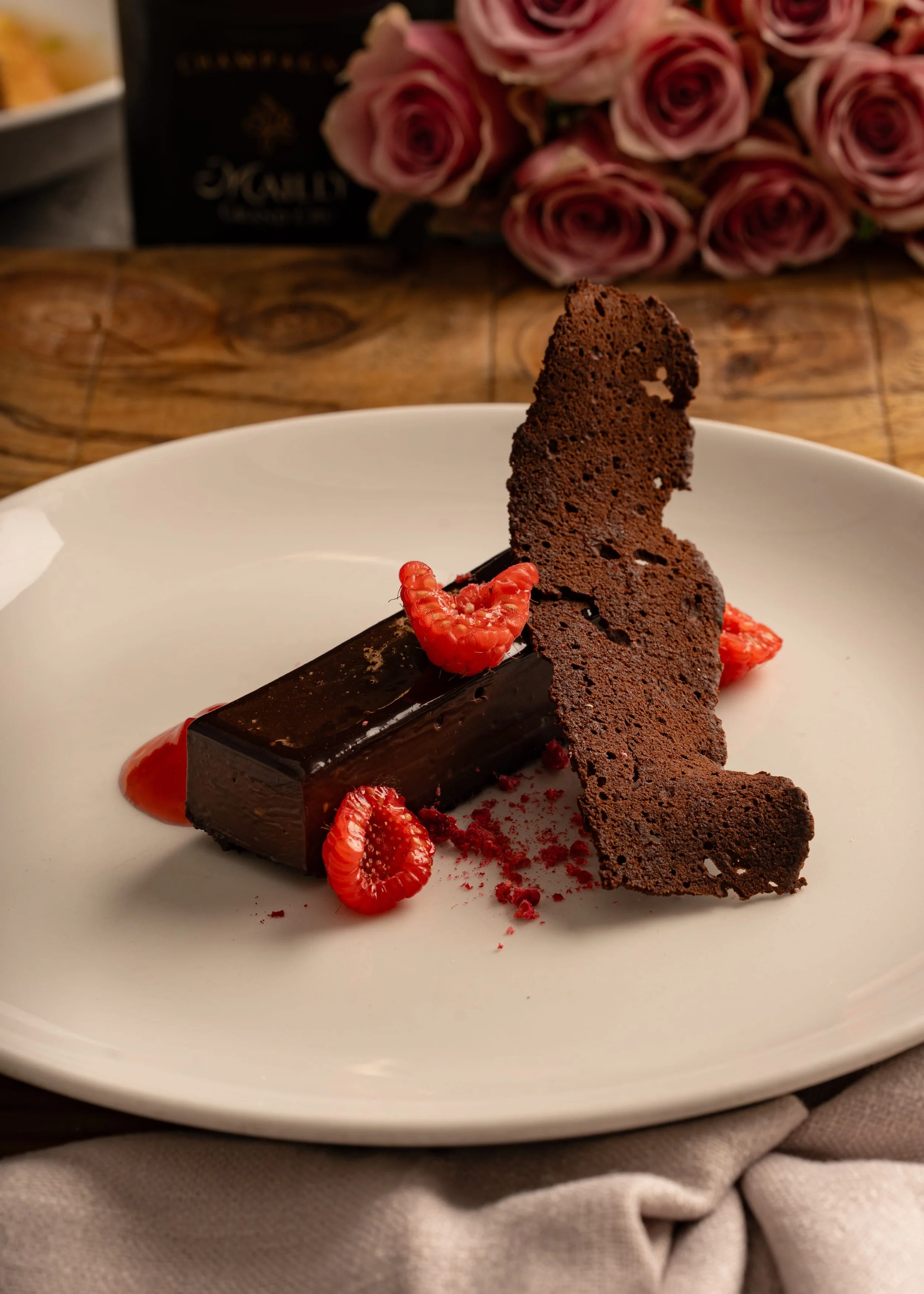 Valrhona chocolate delice, raspberries, chocolate tuile